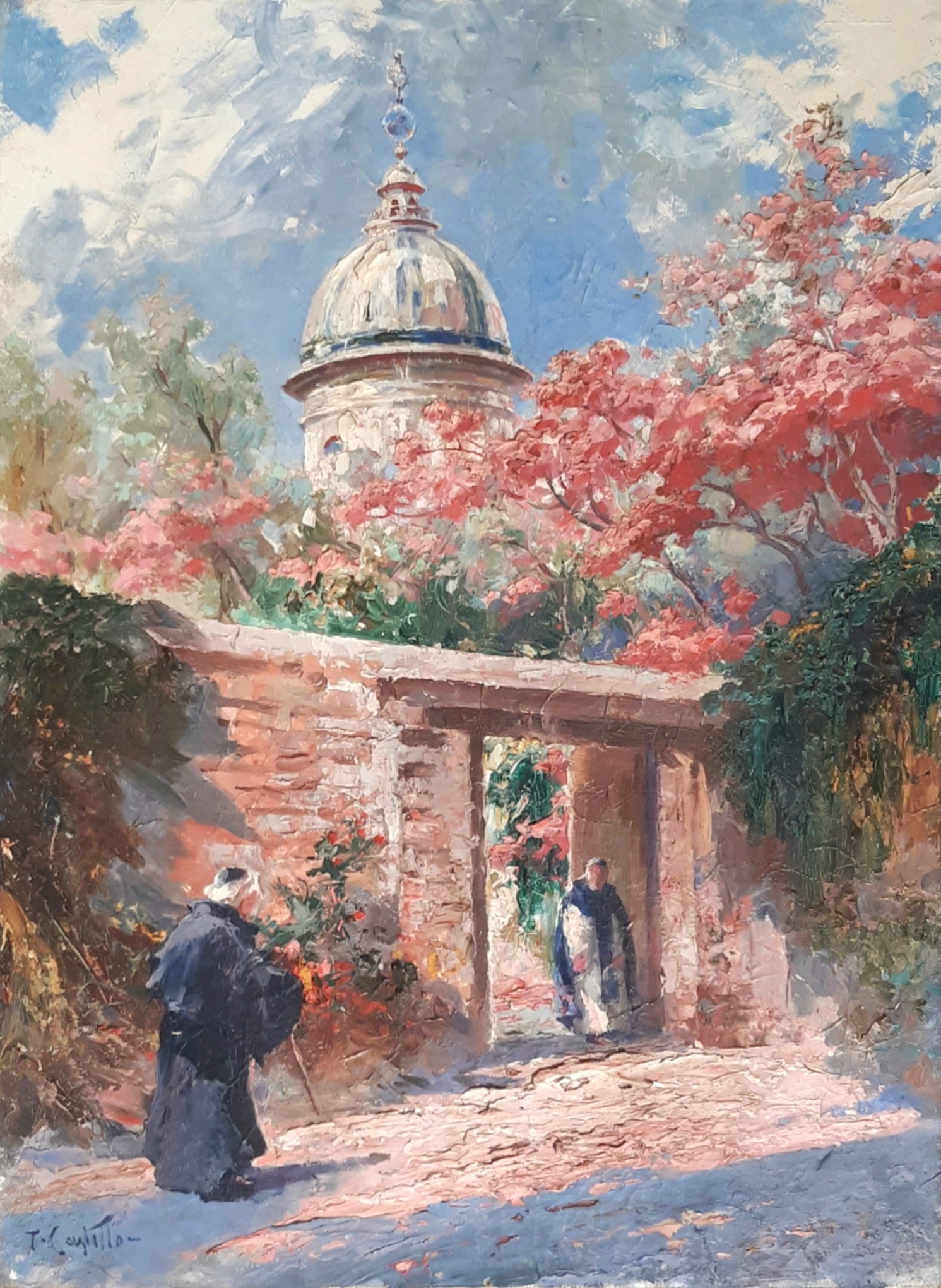 Lapachos en flor, un óleo apenas conocido y casi olvidado del maestro peruano Teófilo Castillo, amerita que nos detengamos en él. Esta obra fue ejecutada posiblemente hacia 1922, y apareció publicada en la edición inaugural de la revista Sol y Nieve. El artista nos presenta esta vez una serena escena primaveral que está enmarcada por una vegetación abundante y un majestuoso lapacho rosado que presume su exuberante floración. Dos hermanos de la Orden de Predicadores se encuentran en un antiguo portón del convento. Se trata de una escena de la vida cotidiana, en la que el artista nos sitúa a una distancia justa donde nos permite ser testigos privilegiados del momento sin llegar a invadir la intimidad de los personajes. Un anciano fraile de cabeza blanca y bastón en mano se acerca lentamente al portón; el otro, un poco más joven, sale a su encuentro y lo espera a la sombra del dintel. Asoma imponente por detrás de la escena, la cúpula de la Basílica del Rosario. Considerando la perspectiva de la imagen, podemos pensar que este muro, que hoy ya no existe, se levantaba en la parte posterior del templo, seguramente donde hoy se encuentra uno de los patios que está dentro de la Universidad dominica. El manejo cromático del artista asombra, la luz llena la escena y los colores del follaje tiñen todo el ambiente cuidando de no permitir que la atmósfera pierda la calma y la serena alegría que nos propone esta jornada primaveral.